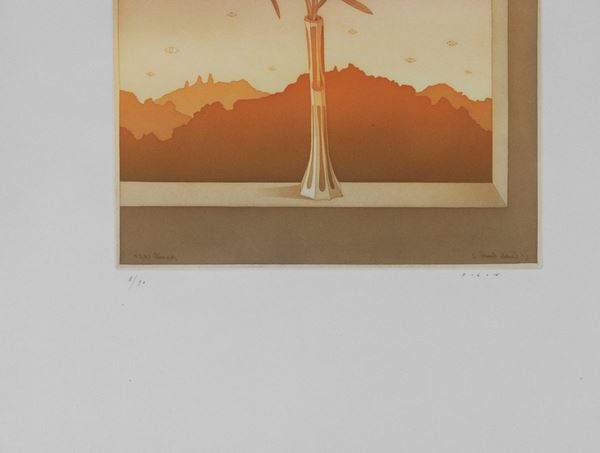 Firmata. "Finestra con vaso e fiore" litografia a colori multiplo 8/90 cm 37 x 29