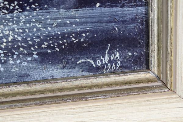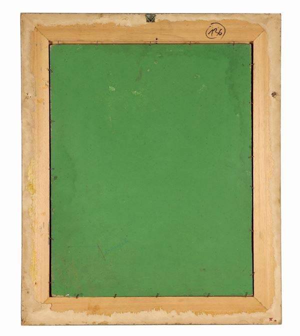 Firmato e datato 1969. "Madonna con Bambino" olio monocromo su truciolato cm 50 x 40