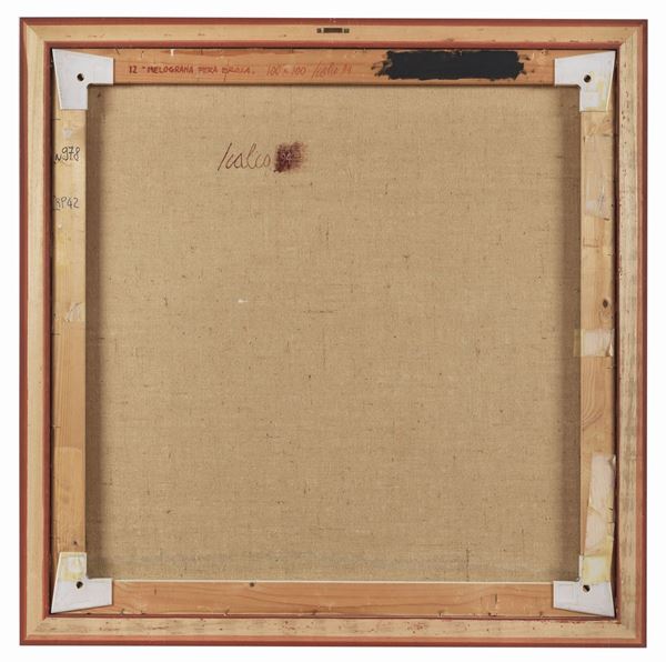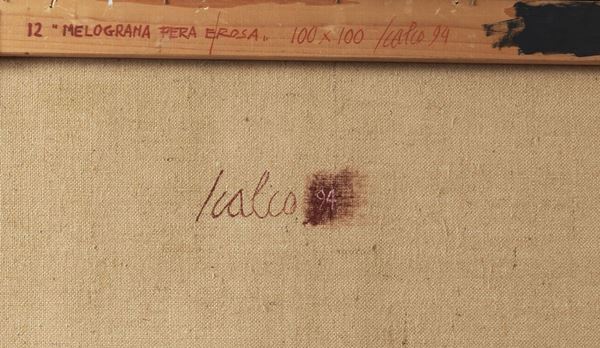 Firmato e datato 1994. "Melograna, pera e rosa" olio su tela cm 100 x 100