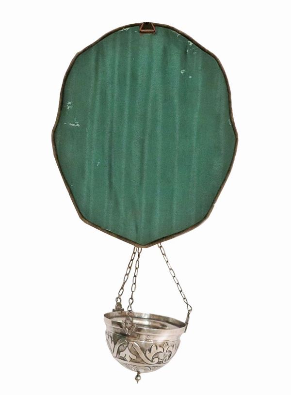 Acquasantiera romana in argento cesellato e sbalzato, montata su supporto in velluto verde