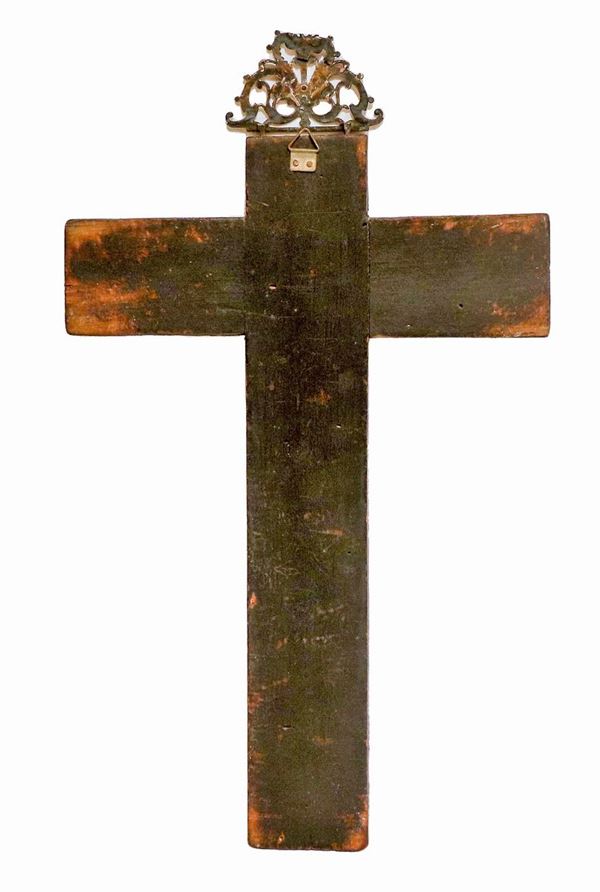 Antica croce in legno rivestita da crocifisso dipinto su rame