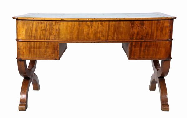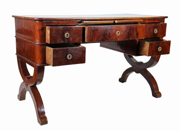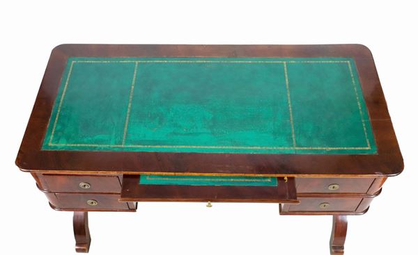 Antica scrivania toscana da centro Secondo Impero in mogano, con pianetto scorrevole, cinque tiretti, gambe ad arco e piano in pelle verde