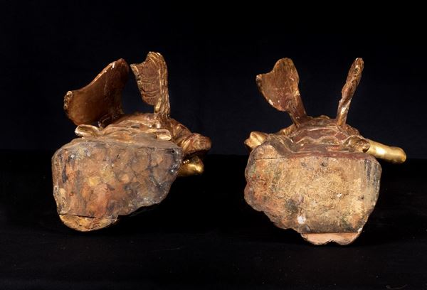Coppia di antiche sculture "Angeli", in legno dorato ed intagliato