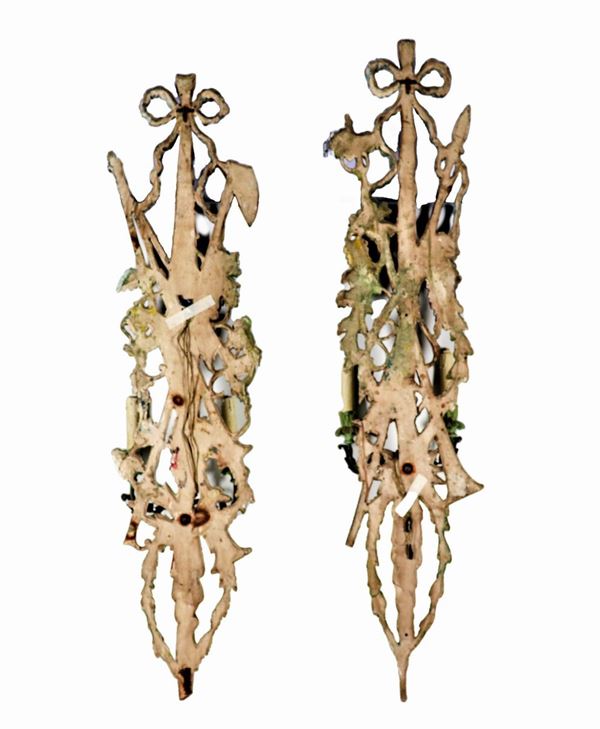Coppia di appliques in legno decorato e policromato con intagli a motivi Luigi XVI, 2 luci ciascuna