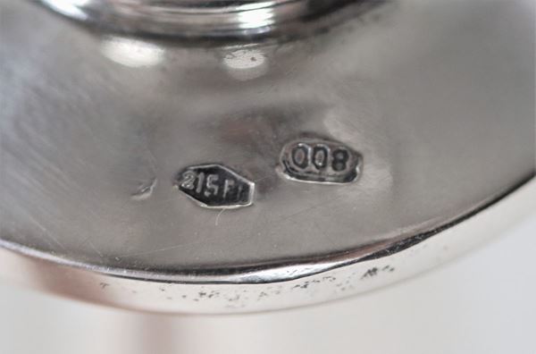 Coppia di candelabri in argento sbalzati e cesellati a motivi Impero, sorretti da piedini leonini, 5 fiamme ciascuno, gr. 2830