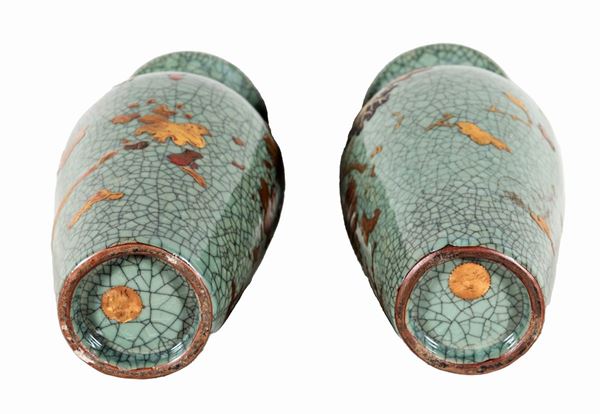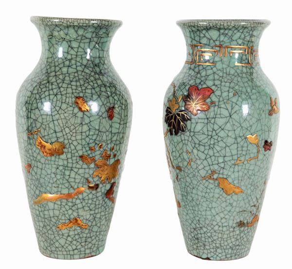 Coppia di vasi giapponesi in porcellana verde, con decorazioni policrome a rilievo di fiori ed uccelli esotici