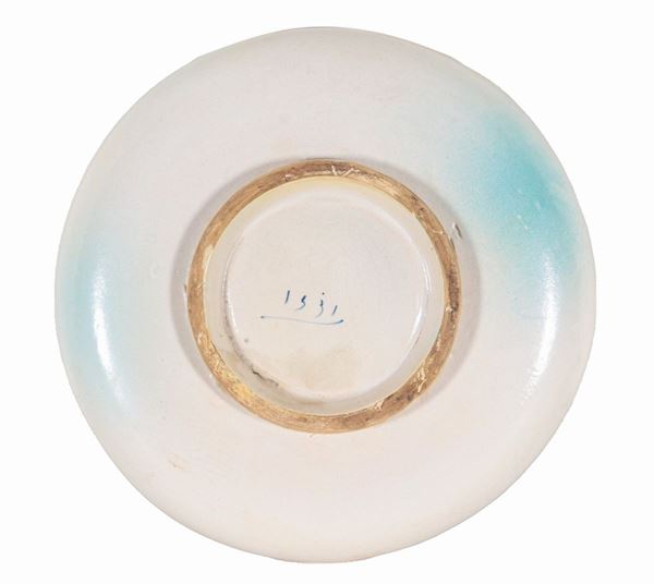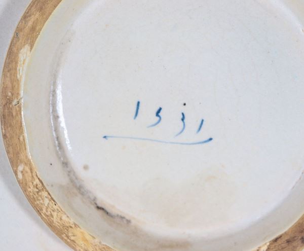 Crespina in maiolica Casteldurante, con al centro decorazione variopinta "MARCVS CVRTIVS"