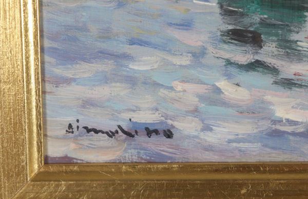 Firmato. "Paese costiero e barche con pescatori", olio su compensato