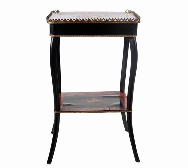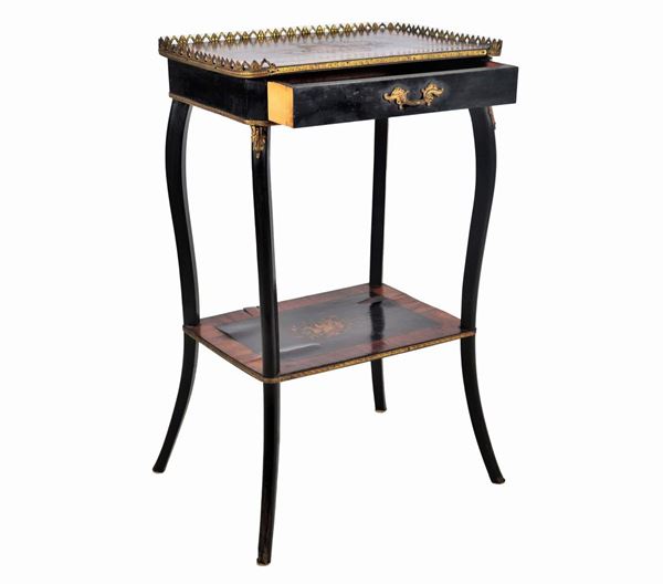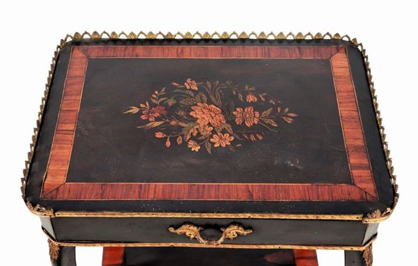 Gueridon francese da centro a forma rettangolare in legno ebanizzato e noce, con intarsi a motivi di mazzetti di fiori, un tiretto centrale, [..]