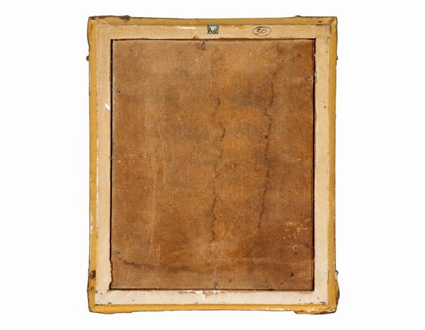 Firmato. "L'incontro galante", piccolo dipinto ad olio su tela applicata a masonite