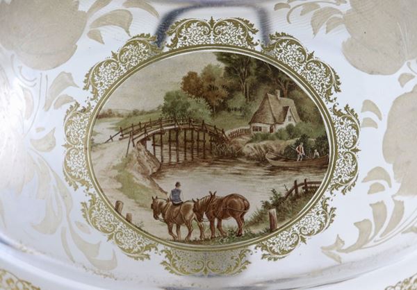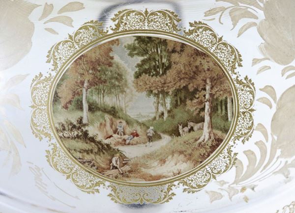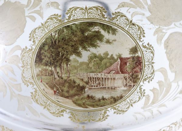 Lampada da tavolo in cristallo, con decorazioni incise e dipinte di medaglioni con paesaggi contadini e lumeggiature in oro zecchino. Firmata [..]