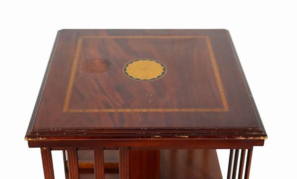 Libreria girevole inglese in mogano, con piano intarsiato in legno satinato con filettature e rosone centrale