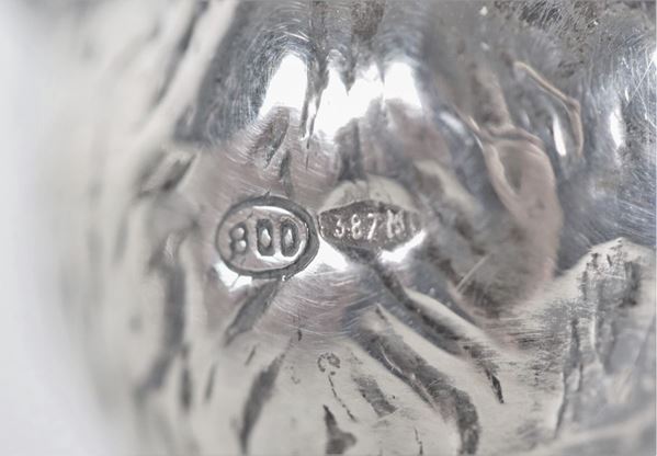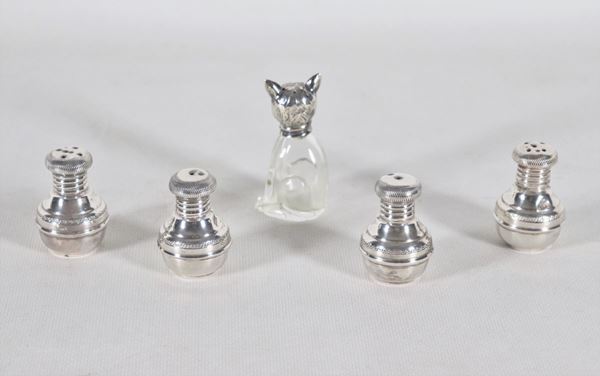Lotto di cinque piccole saliere e pepiere in argento e cristallo, gr. 100