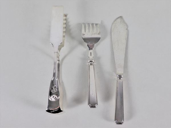 Lotto di tre posate da portata in metallo argentato: due da pesce e una pinza