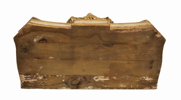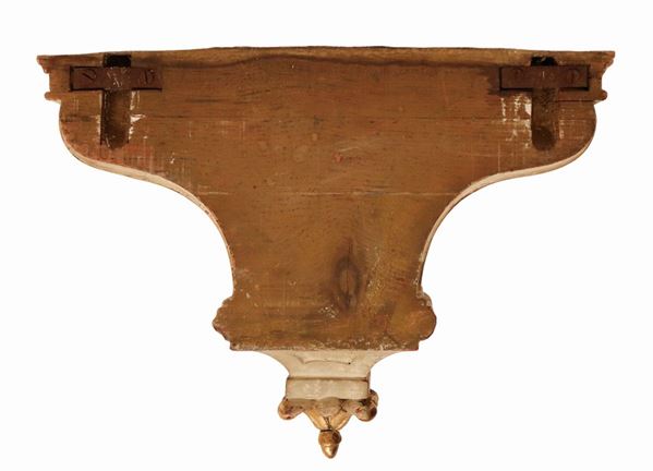 Mensola da muro di gusto neoclassico in legno dorato e laccato avorio, con testa di leone e rosoni a rilievo
