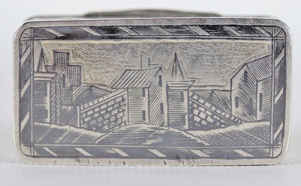 Piccola tabacchiera in argento niellato ed inciso con "Vedute di città"