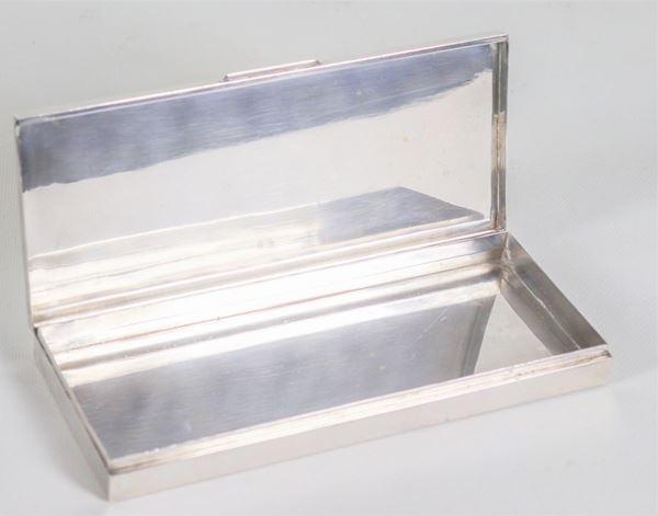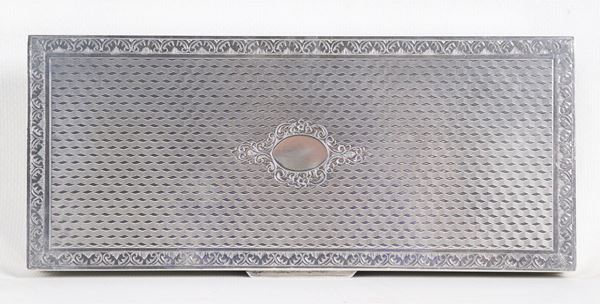 Scatola portasigarette rettangolare in argento, coperchio cesellato a motivo guilloché, gr. 310