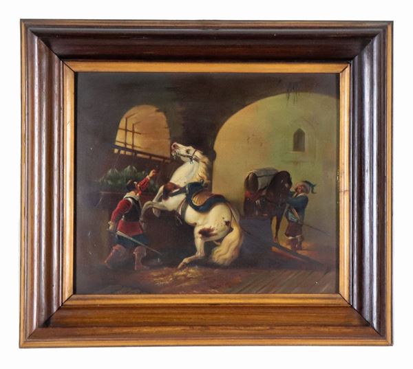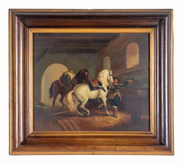 "Stallieri con cavalli", coppia di piccoli dipinti ad olio su tavola