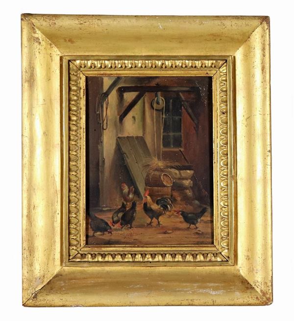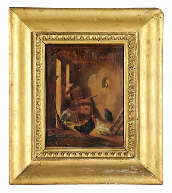 "Interni di stalle con galli e tacchini", coppia di piccoli dipinti ad olio su tela