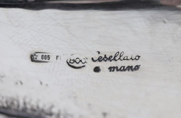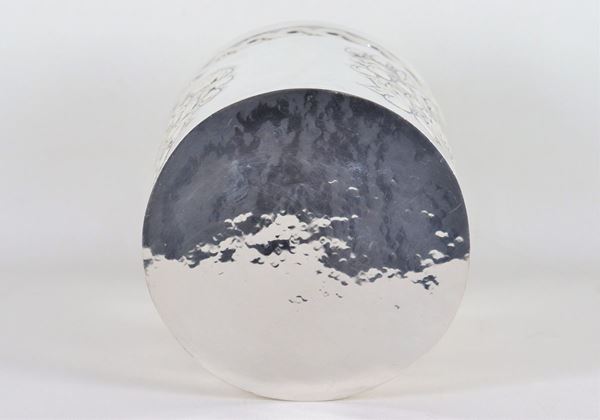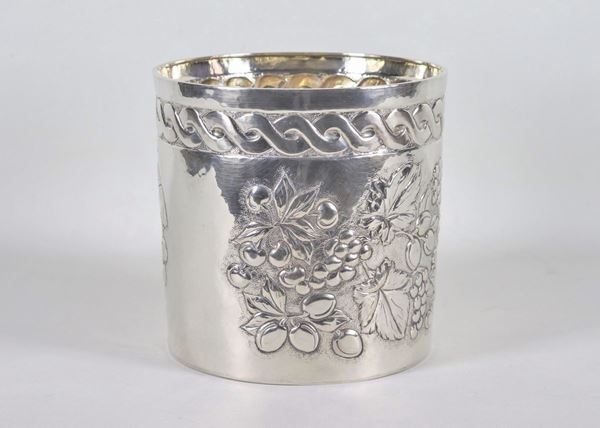 Secchiello portachampagne in argento cesellato e sbalzato a motivi di grappoli d'uva, bordo a cordone intrecciato, gr. 1130