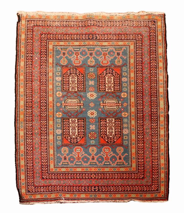 Tappeto persiano Kurdistan a fondo azzurro con bordo rosso, M. 1,43 x 1,06