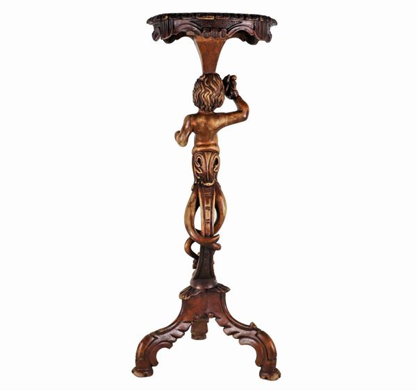 Trespolo veneto in legno di frutto con scultura di "Putto con grappolo di frutta", sorretto da tre gambe ricurve