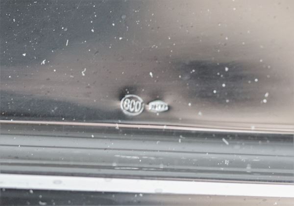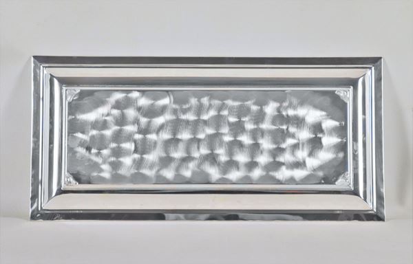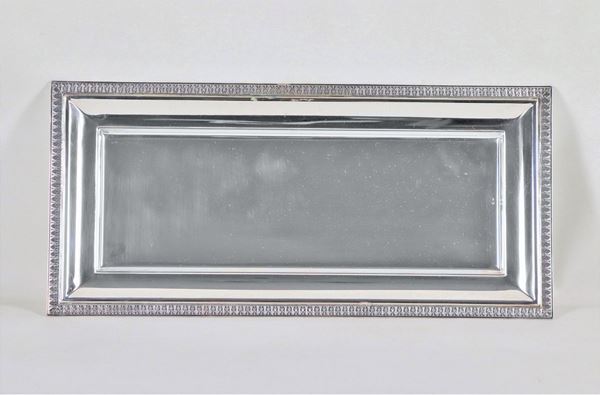 Vassoio rettangolare in argento, con bordo cesellato e sbalzato a motivi Impero, sorretto da quattro piedini ricurvi, gr. 730