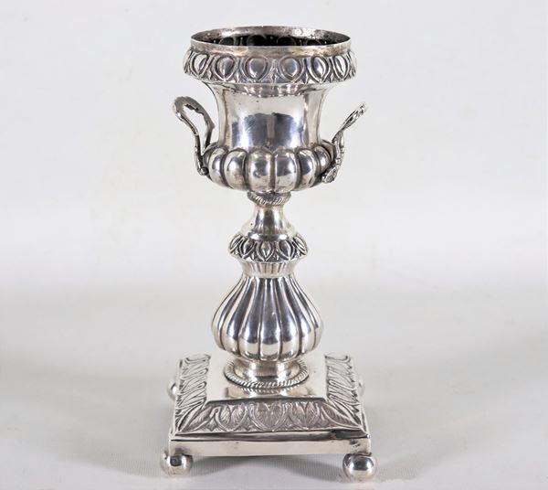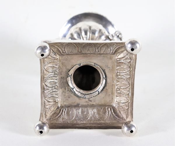 Antica anfora orientale in argento cesellato e sbalzato, sorretta da quattro piedini a sfera, gr. 385