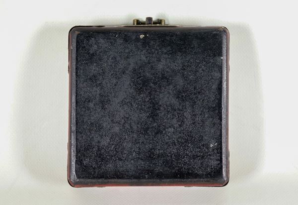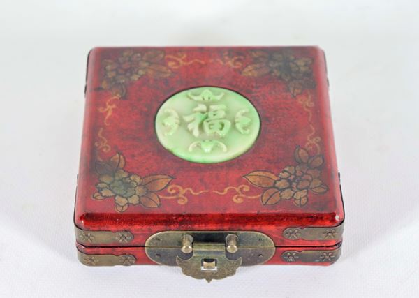 Antica bussola cinese con scatola laccata e decorata, sul coperchio medaglione in giada verde