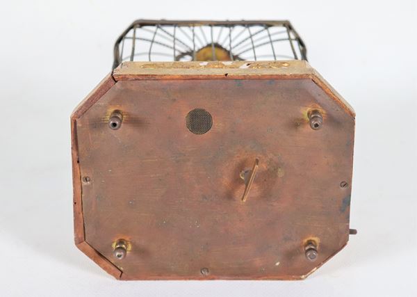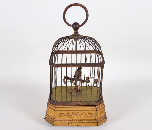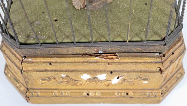 Antica gabietta con uccellino e carillon, in metallo, con base in legno dorato e intagliato
