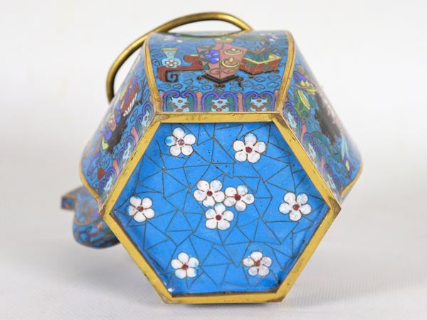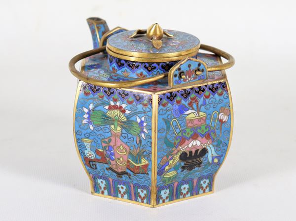 Antica piccola teiera cinese esagonale in smalto cloisonné, con decorazioni policrome su fondo celeste, manico in bronzo dorato
