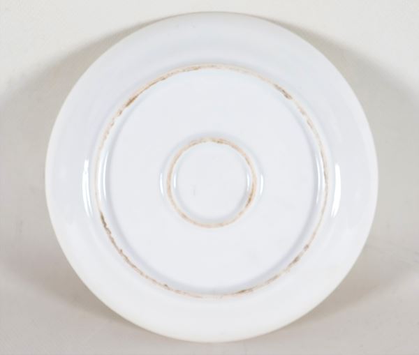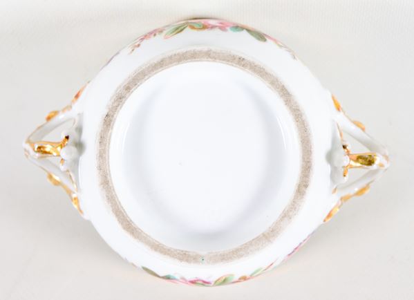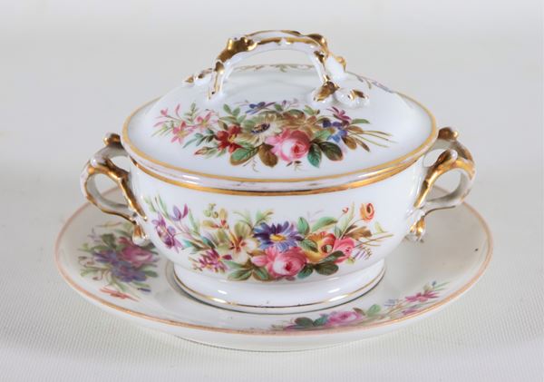 Antica piccola zuppiera con sottopiatto in porcellana bianca, con decorazioni variopinte a mazzetti di fiori, pomo e manici a forma di rami [..]