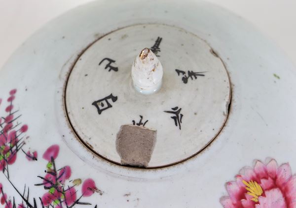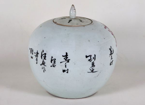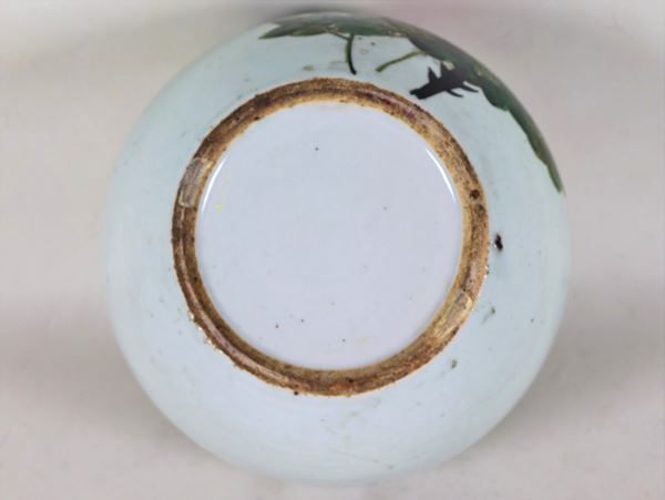 Antica potiche cinese in porcellana, con decorazioni in smalto a rilievo a motivi di fiori e uccello esotico