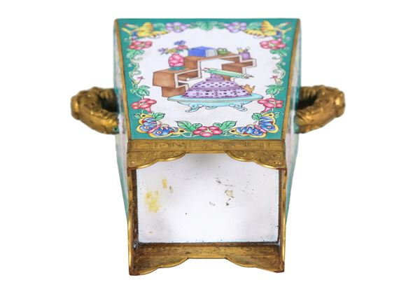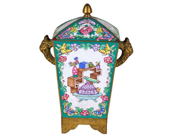 Antica scatola cinese in porcellana, interamente rivestita in smalti policromi su fondo verde a motivi di ghirlande di fiori, frutta esotica [..]