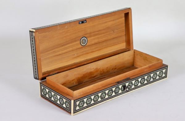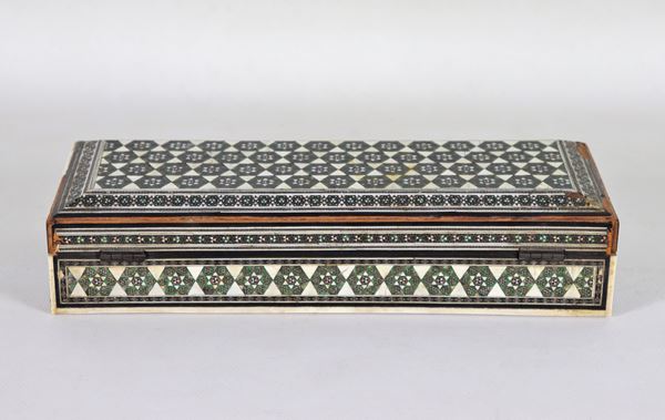 Antica scatola orientale rettangolare in legno, interamente intarsiata a motivi geometrici