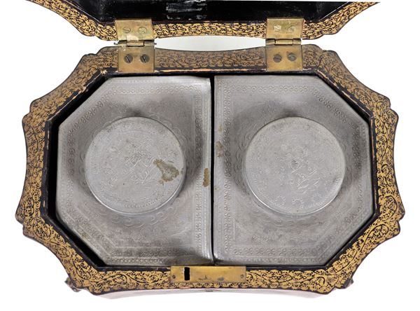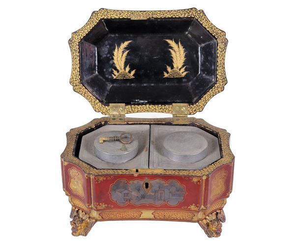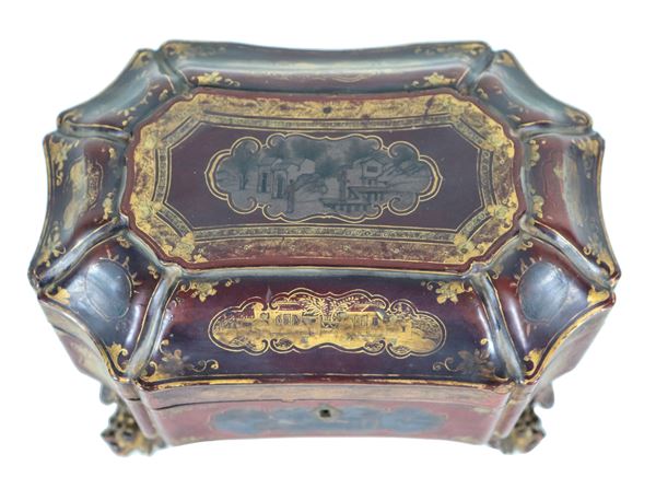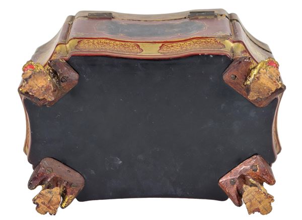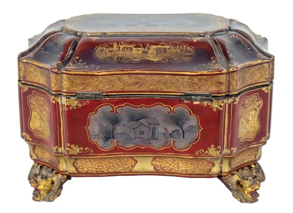 Antica scatola portatè cinese in legno laccato e dorato, a forma ovale sagomata con decorazioni a motivi orientali, piedini in bronzo e due [..]