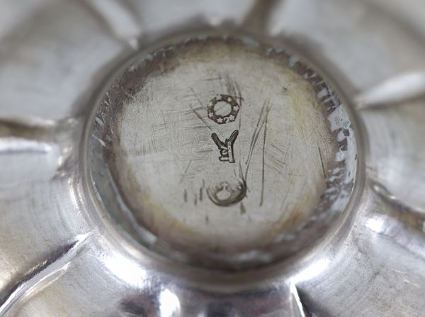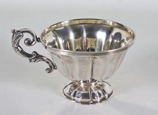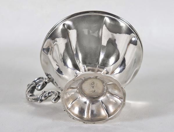 Antica tazza in argento cesellato e sbalzato con manico ricurvo, gr. 110