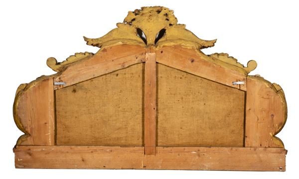 Antica testata da letto Luigi XV, in legno dorato e intagliato a volute di foglie d'acanto , fregi e fiori