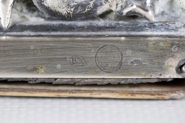 Antico centrotavola in argento a forma ovale centinata, cesellato e sbalzato sul bordo a motivi di allegorie di frutta, fondo a specchio