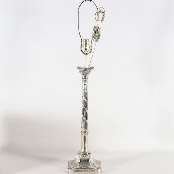 Antico grande candeliere a forma di colonna in metallo argentato, sbalzato e cesellato a motivi Luigi XVI
