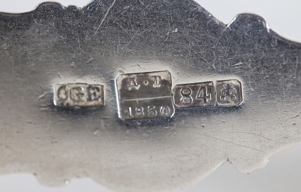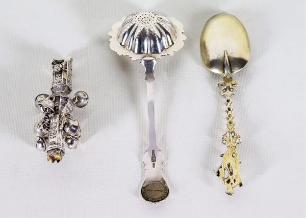 Antico lotto in argento cesellato e sbalzato di un sonaglino con fischietto, un passino russo per tè e un cucchiaio da cerimonia (3 pz), gr. [..]