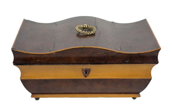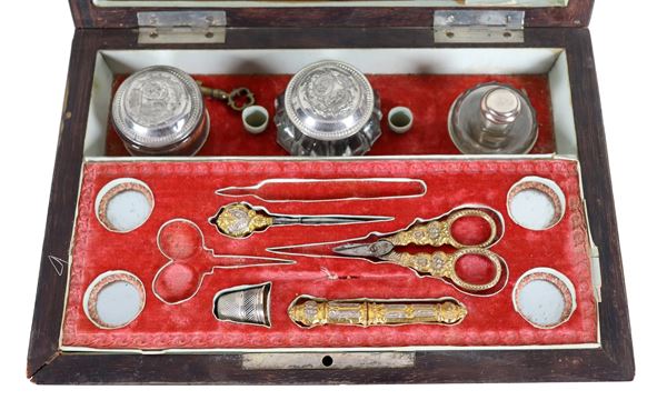 Antico necessaire da viaggio francese, a forma di bauletto in radica di tuja e legno satinato