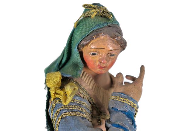 Antico pupazzo napoletano da presepe "Contadinella" in terracotta, con vestiti in seta originali danneggiati