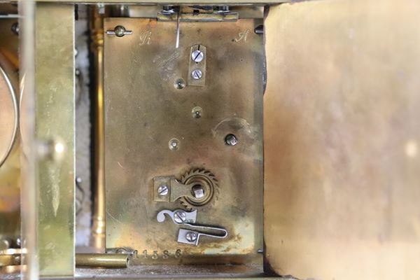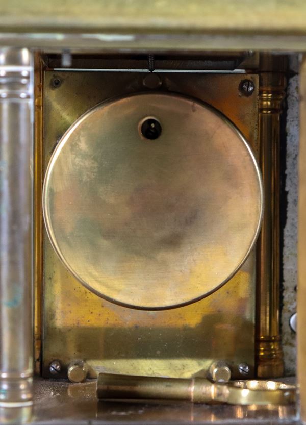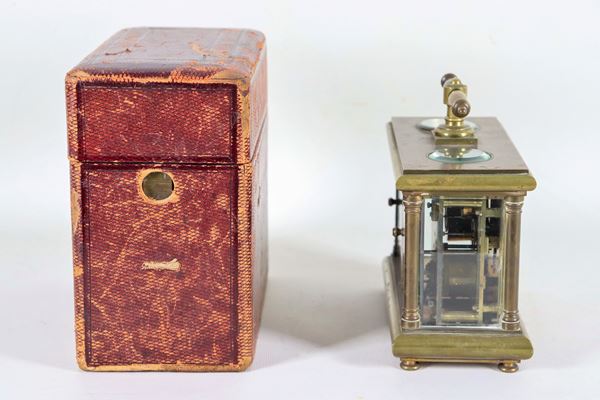 Antico strumento da viaggio con orologio, barometro aneroide e bussola, in metallo dorato con colonnine neoclassiche