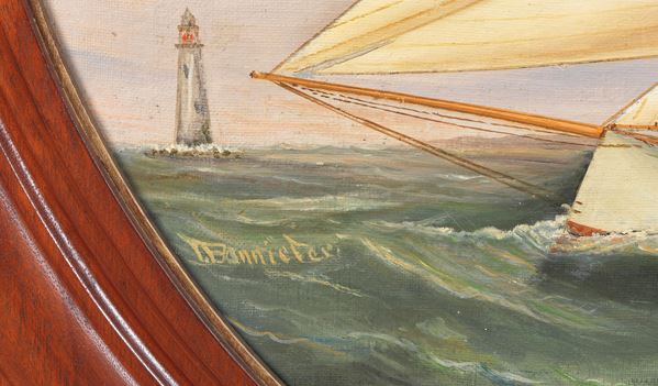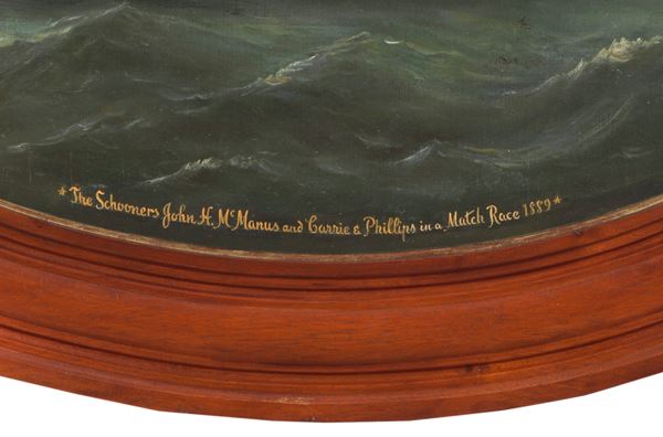 Firmato, iscritto e datato. "The Schooners John H. McManus and Carrie E. Phillips in a Match Race 1889", dipinto ovale ad olio su tela