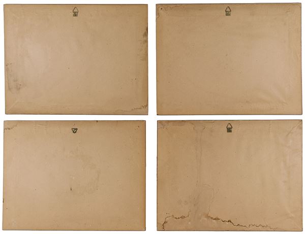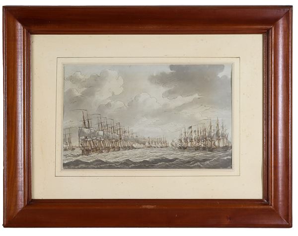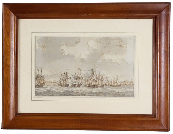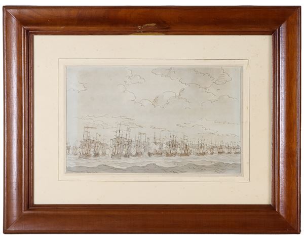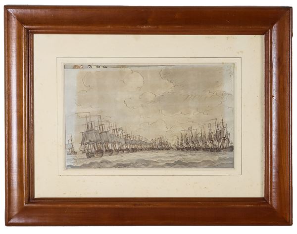 "Battaglie navali", lotto di quattro antichi disegni su carta a china e all'acquarello