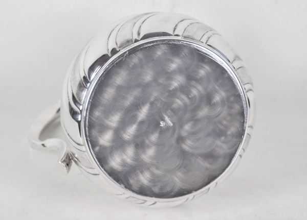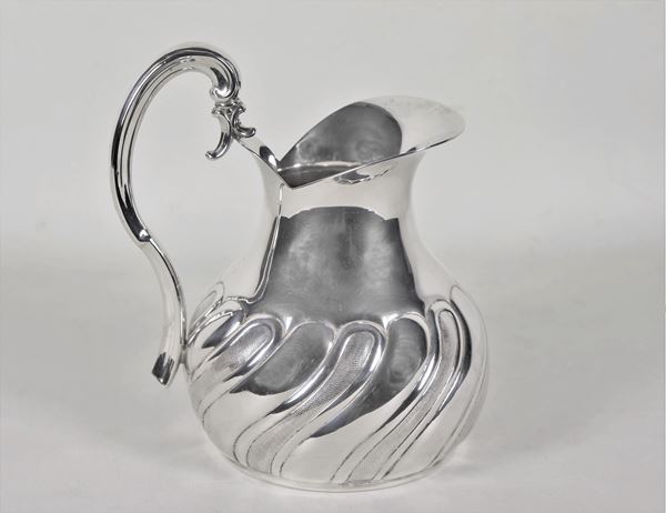Brocca per acqua in metallo argentato, sbalzato e cesellato a torchon
