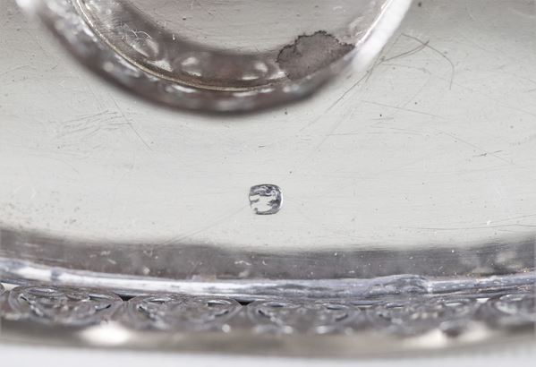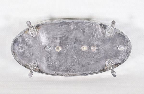Calamaio Impero in argento a forma ovale con ringhierina traforata a motivi di palmette, sorretto da quattro piedini ricurvi, due flaconi porta [..]