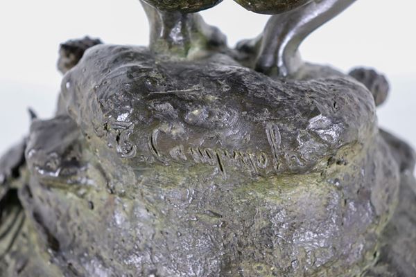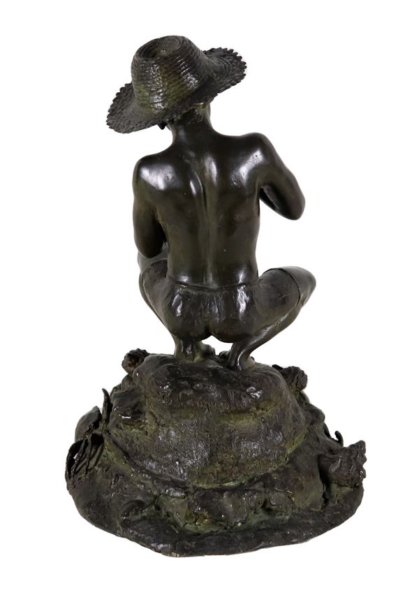 Firmata. "Pescatorello con crostacei e molluschi", scultura in bronzo di ottima fattura