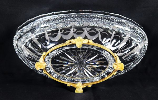 Centrotavola francese in puro cristallo interamente lavorato a punta di diamante, sorretto da base in bronzo dorato con quattro piedini leoni [..]